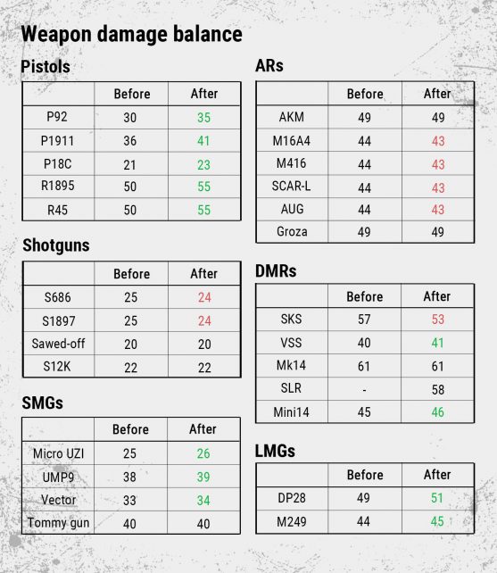Pistols in general have received a significant damage upgrade while ARs using 5.6 ammo have had a 1 point reduction in damage. The pump action shotgun and 2 barrel both received a 1 point nerf as well. Under DMRs the SKS has 4 points less damage, while the VSS and Mini 14 both received a single point increase in damage.